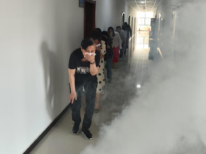 随着警报声响起,疏散逃生演练正式拉开帷幕。全体干部职工迅速按预定疏散路线,用湿毛巾捂住口鼻、低姿前行,仅用时3分钟,便快速有序撤离至安全区域。整个疏散过程紧张有序、行动迅速,达到了预期演练效果。