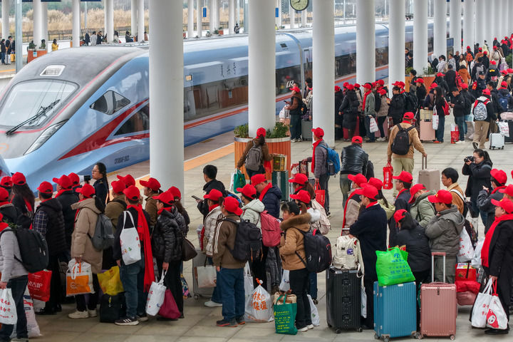 2025年2月5日,务工专列乘客在云南省广南县站登车(无人机照片)。新华社发(彭奕凯 摄)