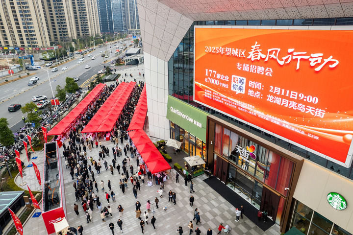 这是2025年2月11日在湖南省长沙市望城区龙湖月亮岛天街商场外坪拍摄的招聘会现场(无人机照片)。新华社记者 陈思汗 摄