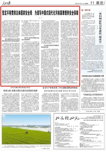 4月17日出版的《人民日报》,刊发河南省委书记刘宁署名文章:《坚定不移贯彻总体国家安全观 为谱写中国式现代化河南篇章提供安全保障》。