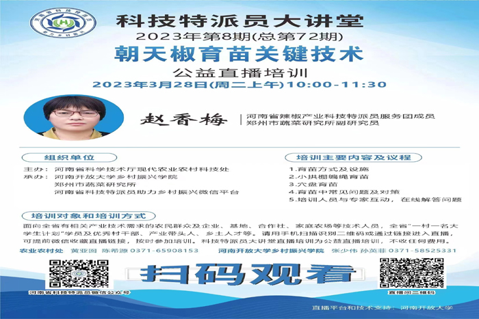 3月28日,市蔬菜所副研究员赵香梅在科技特派员大讲堂开展公益直播培训。本次培训由河南省科技厅主办,河南开放大学乡村振兴学院、市蔬菜所、河南省科技特派员助力乡村振兴微信平台承办。全省“一村一名大学生计划”学员及优秀村干部,农业企业、合作社、家庭农场技术人员,辣椒产业带头人,辣椒种植户等共计2400余人在线参加了培训。