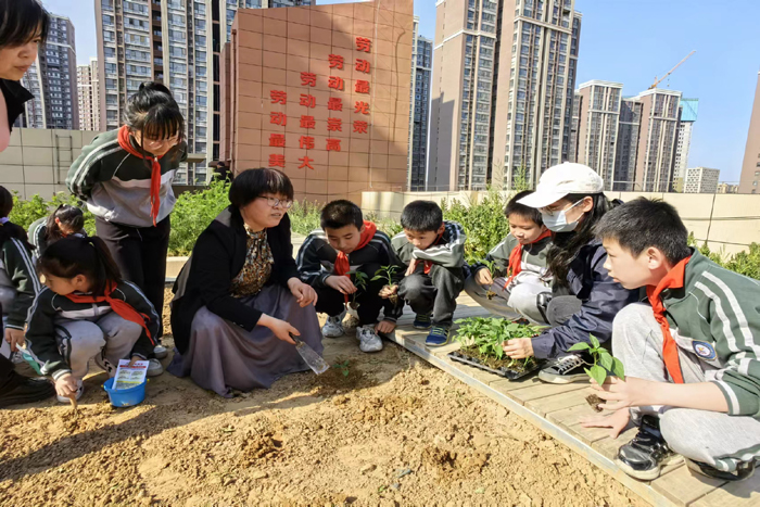 在学校学生劳动实践基地,赵香梅老师向同学们讲解了蔬菜种植的具体方法和步骤,示范了蔬菜种植的实践操作方法。同学们在赵香梅老师的指导下,通过分工合作,依次进行撒肥、栽苗、浇水,种出了一排排菜苗。