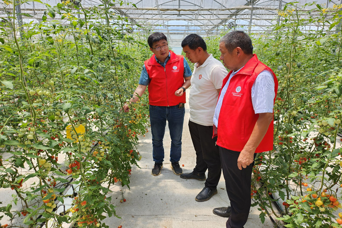 在中以现代农业产业园,产业园正在召开灌涨镇首届杨集番茄采摘节。服务团专家们来到园区内的智能温室,认真查看番茄、黄瓜、苦瓜、水培蔬菜等的生长情况,针对部分樱桃番茄近果柄处未转红、颜色偏白等问题提出了意见建议。