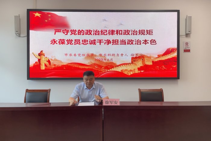 市农委党组成员、市农科所负责人徐军安讲专题党课。在严守党的政治纪律和政治规矩方面,告诫全体党员要懂敬畏、知进退,守底线、常学习;要有大智慧,不耍小聪明;要讲大利益,不贪小便宜;要搞大团结,不搞小圈子。对于如何建设农业强国,建设都市型现代农业,他强调,作为农业科研单位,要解决科研、生产“两张皮”现象,科研要以生产为出发点,切实转化为生产力和经济效益;要做好人才储备、培养工作,采取“传帮带”等方式,传授实践经验,培养一批工作态度正、热情高、干劲足的年轻科研人员;要鼓励支持与其他科研院所、高校、企业等平台合作,共建共创新课题、新项目,在提升我所科研能力、建设高水平平台上发力,为建设都市型现代农业强市提供有力支撑,为“三农”事业、全面推进乡村振兴贡献力量。