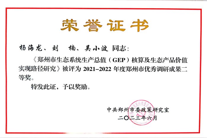 2022年由都市农业研究室完成的调研项目《郑州市生态系统生产总值(GEP)核算及生态产品价值实现路径研究》近日被市委政研室评为“2021-2022年度郑州市优秀调研成果二等奖”。该奖项是由市委政研室组织的市级评奖工作。