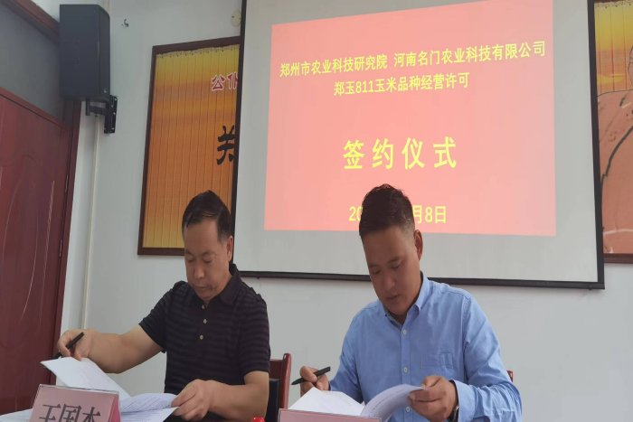 郑玉811是由我院玉米研究室选育而成,2023年通过河南省审定,审定编号豫审玉20230007。该品种具有优质高产、大穗抗病等突出特点,适宜河南省夏播区域种植。为了加快该玉米新品种的推广应用,郑州市农业科技研究院领导高度重视,根据原《郑州市农林科学研究所促进成果转化管理办法》的有关规定,及时对外发布公告,与河南名门农业科技有限公司多次商谈,双方就玉米新品种郑玉811的品种生产 、经营、维权打假和成果申报等相关事宜达成了一致意见。