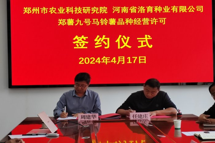 4月17日,郑州市农业科技研究院举行马铃薯品种郑薯九号经营许可签约仪式。院党委委员、副院长田朝辉出席仪式并讲话,河南省洛育种业有限公司总经理任建庄、科研科、纪检监察室及马铃薯研究中心相关人员参加签约仪式。