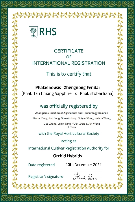 12月10日,由郑州市农科院花卉研究室团队选育的“郑农粉黛”蝴蝶兰(Phal. Zhengnong Fendai)在英国皇家园艺学会(RHS)获得国际登录,这是我院首个获得“国际身份证”的蝴蝶兰新品种,也是河南省第一个利用蝴蝶兰原生种进行种质创新、获得国际登录的蝴蝶兰新品种,标志着我院蝴蝶兰育种工作取得重大突破。