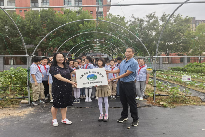 在阳光农场,田院长首先将“校园研学科普微农场”牌匾授予校长,并表示“校园研学科普微农场”不仅是一份荣誉,更是一份沉甸甸的期待,希望通过这类活动将最前沿的农业知识和种植技术从实验室、实验田带到校园里,在孩子们心中播下热爱科学、尊重劳动的种子。