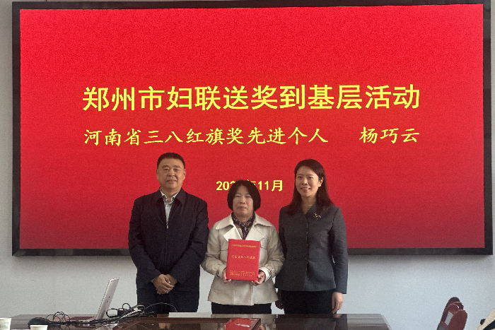 仪式中,市妇联主席申宏同志传达了全球妇女峰会的重要精神,强调妇女事业在全局工作中的重要地位,提醒大家牢记领袖嘱托,扛起时代使命。同时鼓励女职工们以榜样为镜,向典型看齐,把榜样力量化为实际行动。市妇联副主席任璐宣读了授予杨巧云同志“河南省三八红旗奖先进个人”的表彰决定。随后市妇联主席申宏为杨巧云同志颁发荣誉证书。
