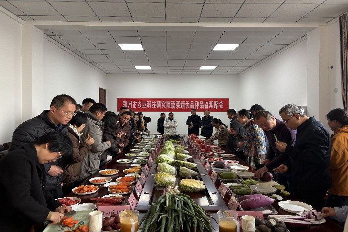 为加快蔬菜新优品种的推广与应用,12月9日,市农科院在荥阳蔬菜科技示范基地举办蔬菜新优品种品鉴观摩会,院领导、学术委员会成员、各科室及研究所负责人、科研人员及蔬菜推广企业等共计50余人参会。