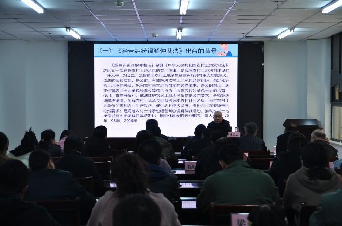 农村经济发展服务科牛晓天同志从农村土地承包经营纠纷调解仲裁法制定的背景、意义、目的、调解仲裁的基本原则、主要内容等方面进行了全面深入的辅导讲解;并结合典型案例,深入剖析了仲裁案件办理的规范流程并开展互动问答。