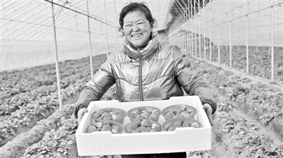偌大的草莓大棚内,徐玉巧忙着筛选装框,红扑扑、鲜灵灵的草莓,像一个个待嫁的姑娘,娇羞羞地坐在白色泡沫箱内。徐玉巧找来的帮工、来自附近村庄的秦军丽和另一个姐妹,熟练地把成熟的草莓轻轻采摘后,放到塑料筐里,交给徐玉巧分拣。徐玉巧是村里的种植大户。除了自家的6亩责任田,又承包了村民的15亩地,徐玉巧和丈夫一年四季吃住在地头的简易板房,累并快乐着。“幸福都是奋斗出来的。咱们赶上了好时候,只要不惜乎力,好好干,好日子还在后头呢!”