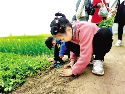本报讯 天朗风和,草长莺飞,穿行于青年路街道明山庙村,一条条水泥路整齐通达,一幢幢农院精致温馨,一片片蔬菜喜获丰收,一张张笑脸洋溢幸福,一幅幅醉人的美丽乡村画卷展现在眼前……4月1日,明山庙村格外热闹,村口的停车场停满了轿车,田间地头聚满了来自城里的游客,挖野菜、摘黄瓜、薅荆芥、摘草莓、挖芹菜……忙得不亦乐乎。