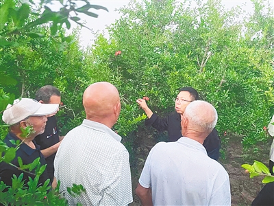 在果园里,“田间课堂”火热开讲。曹教授从除草浇水、施肥用药、剪枝疏花等日常管理技术,谈到品种选育、电商销售等意见和建议,经过一番释疑解惑,石榴种植户们心里也逐渐亮堂起来。特别是曹教授说到“坐果率低、果实个头小、品相差,不是因为管不好,而是你们太‘勤’了”,更是引起了一场争论。