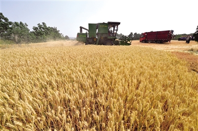 郑州市荥阳市崔庙镇南马寨村的麦田里,收割机在轰鸣 记者 唐强 图
